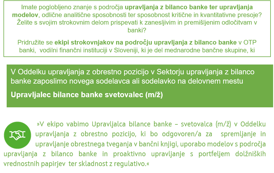 Upravljalec bilance banke svetovalec v Oddelku upravljanja z obrestno pozicijo